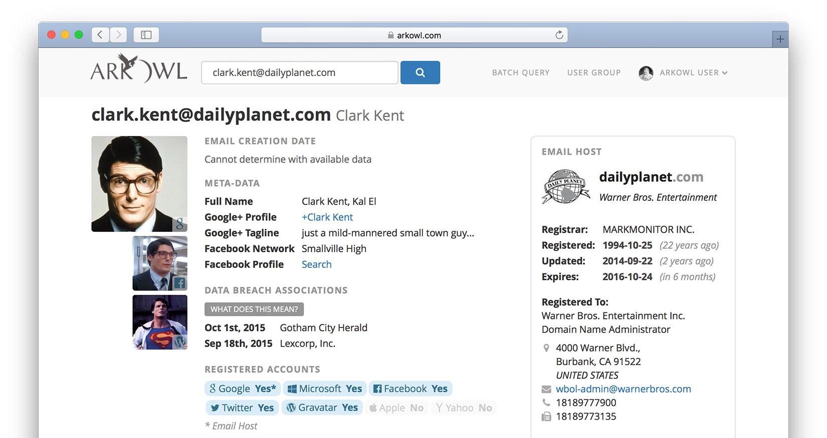 ArkOwl automatically detects and highlights important information for email validation and verification including email age or creation date, real names, known aliases, registration status with popular service providers, and associations with any known data breaches.